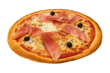 Tomate, emmental, fourme d’Ambert, jambon cru, crème fraîche, olives